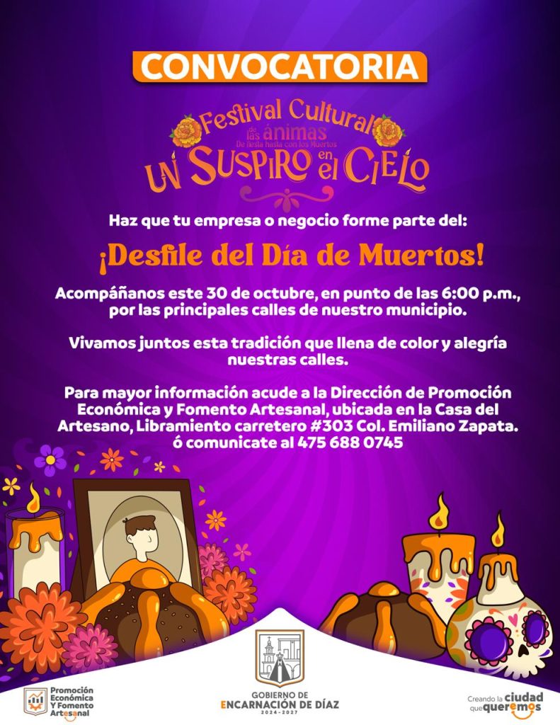 Participa en el desfile del Día de Muertos, para inscribirte o mayor información acude o llama al 475 688 0745 en la oficina de Promoción Económica y Fomento Artesanal.