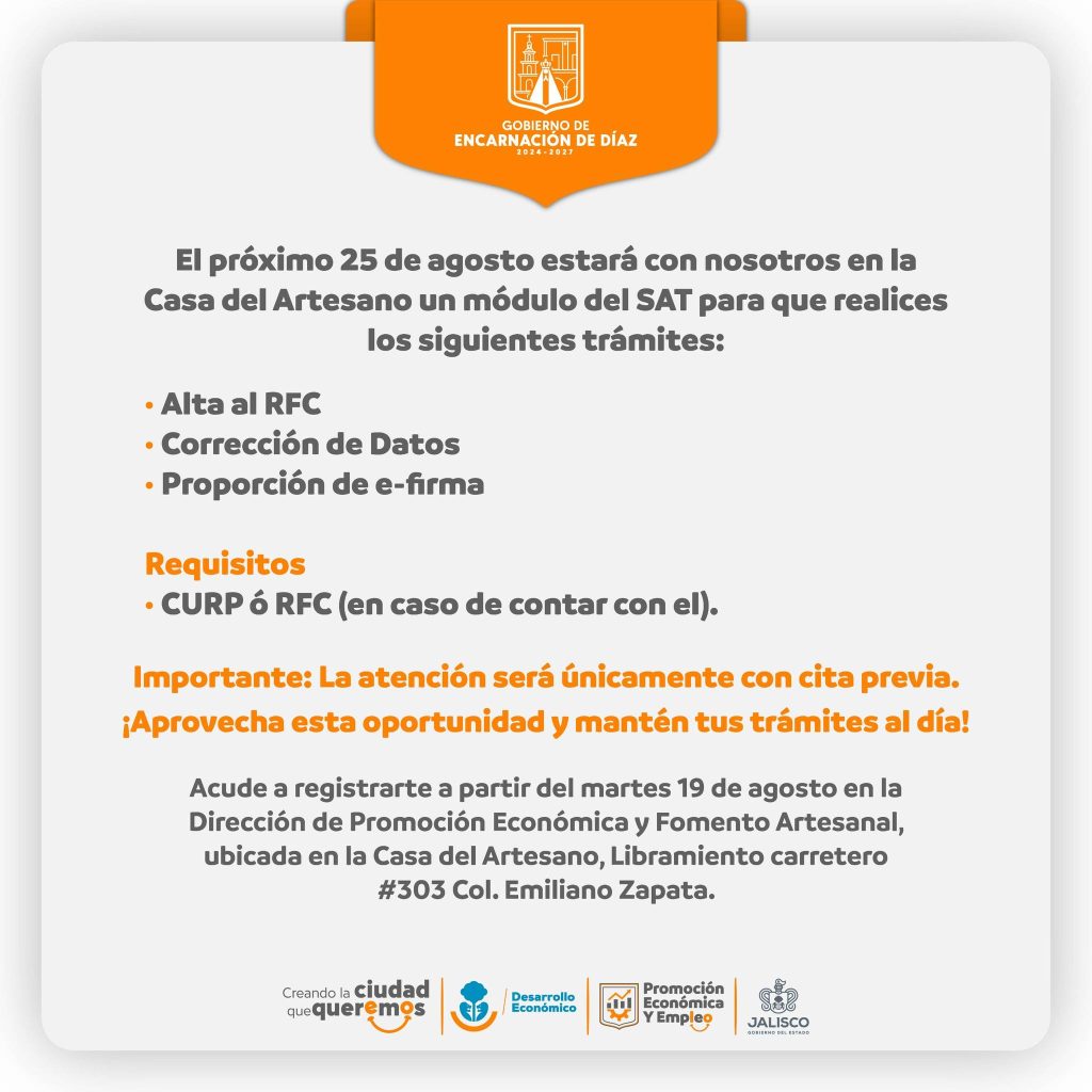El próximo 25 de agosto estará con nosotros en la Casa del Artesano un módulo del SAT para que realices los siguientes trámites: * RFC por primera vez * Corrección de datos * Generación o renovación de tu e.firma Importante: La atención será únicamente con cita previa. Puedes pasar a registrarte y apartar tu lugar […]